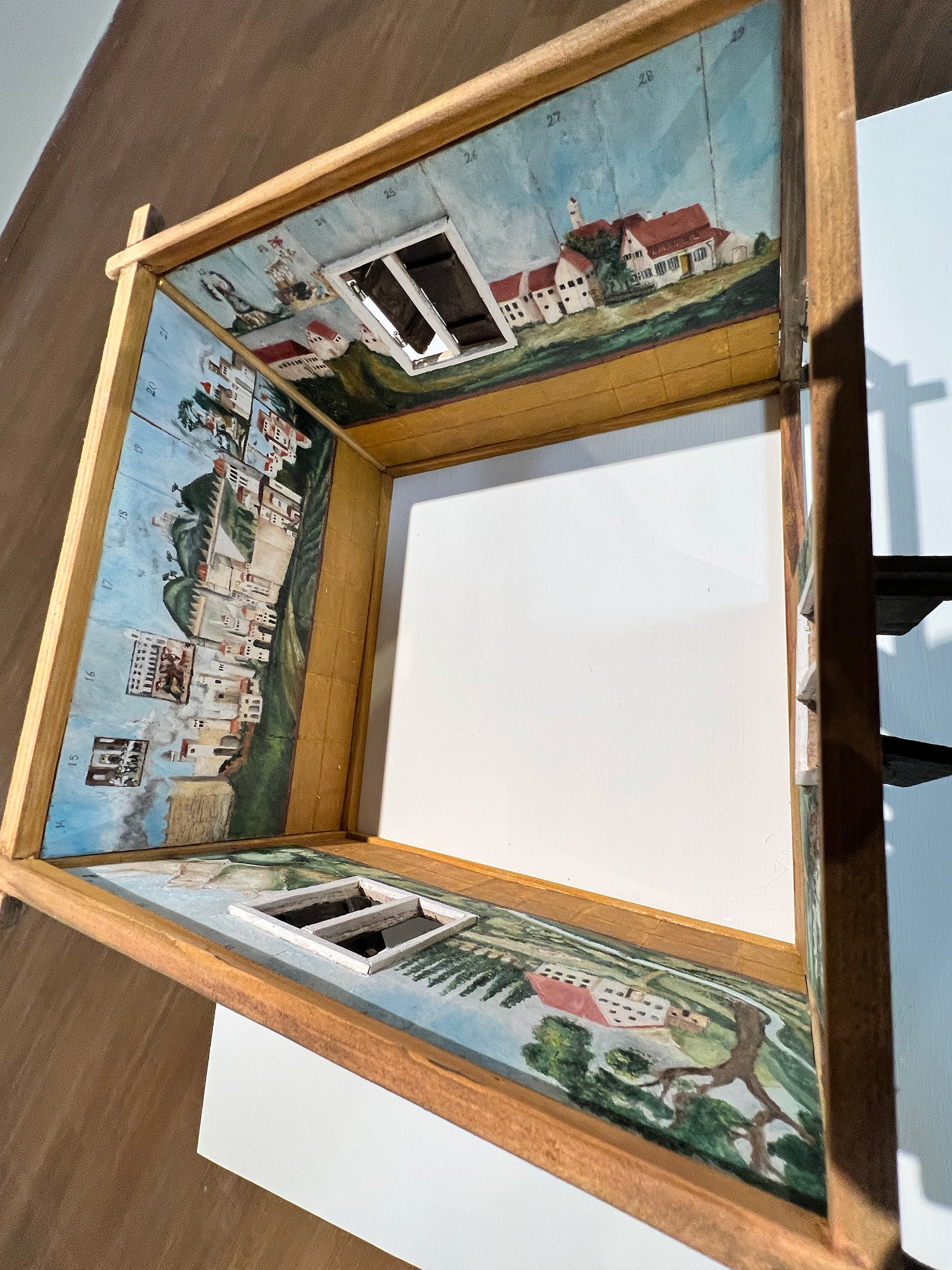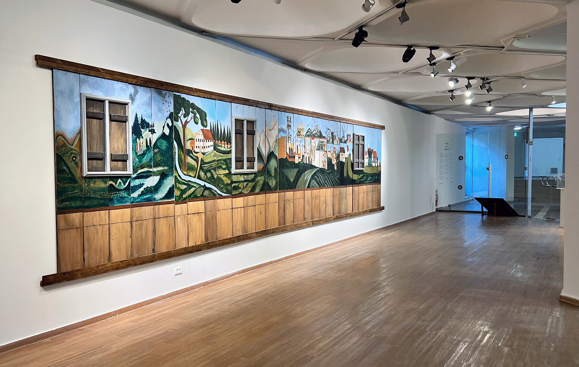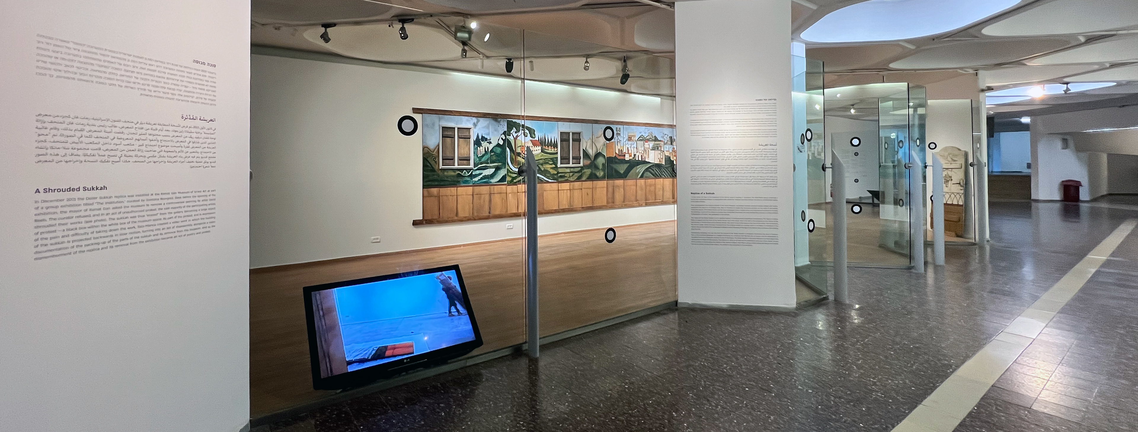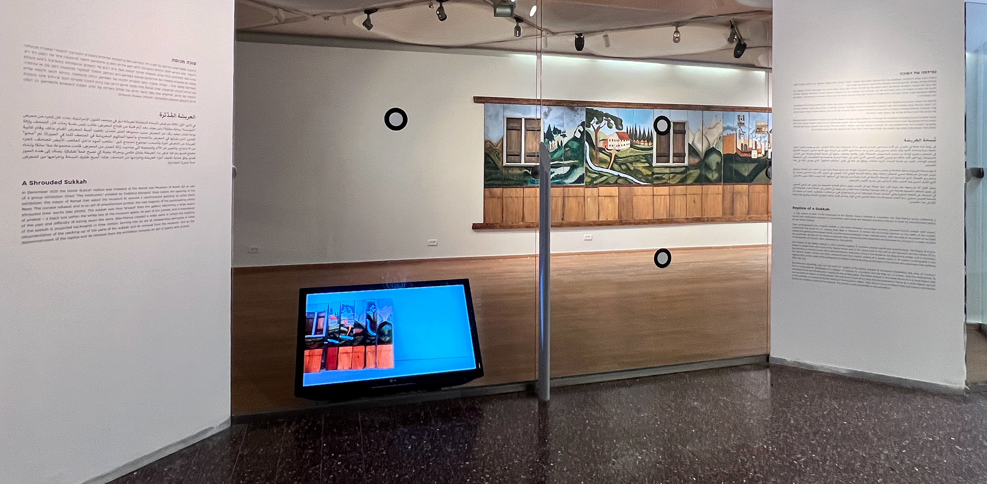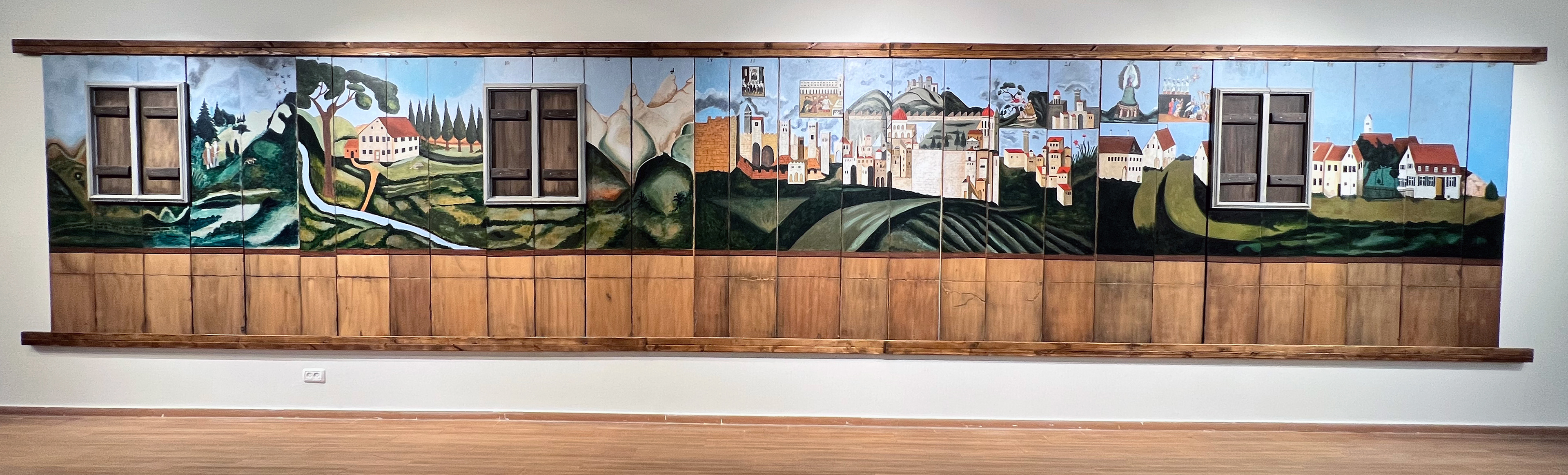 In previous exhibitions, the replica of the Deller Sukkah was displayed as a complete structure. In the current installation, the Sukkah has been dismantled and its panels hung on the wall next to one another, creating new meaning. The walls of the temporary structure become a ten-meter-long landscape painting, while the wooden frame remains standing, without walls, naked within the transparent gallery. Hung on the wall, the landscape has the potential to return to being the four walls of the Sukkah and to its function as a ritual object.