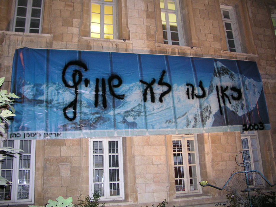The Heara (comments) multidisciplinary art events orchestrated by Lea Mauas and Diego Rotman of the Sala-Manca art group that took place in Jerusalem during the years 2002-2007, in the midst of the Second Intifada, and involved hundred of artists who exhibited site-specific works in significant sites throughout the city, were the most fascinating art events in which I took part. It was during these events that I did my first performances and that I collaborated with other artists to create works of art. Those events enhanced my perception that Jerusalem was the geographical place I would choose in order to express my art without having to run to Tel Aviv to present my portfolio to curators hesitant to drive beyond the Sha’ar Hagai’s junction. It increased my awareness that art should not dwell into Kantian Disinterestedness, but should instead be rooted into the political and the ethical of a ‘here and now’. It was at a time when, with almost daily suicide bombings and the building of the Wall around Jerusalem, the political conflict entered my art more directly consequently to my work as a free-lance news photographer. ‘Here it is not Switzerland’, with black graffiti in Hebrew written over a huge banderol showing Lindt chocolats snowy Alps’ peaks hanging on the facade of the Sergey Coutyard, created the link between my pastoral country of birth, art and the ‘here and now’ that did not allow me to make blind aesthetic choices detached from the actual context. The banderol was exhibited at the art happening ‘Migrashim Harousim’ (2003) together with two Jerusalem Scrolls showing the Separation Wall in Abu Dis. The event was organised by Lea and Diego in response to Art Focus, the international art biennial, taking place nearby at the Museum of Underground Prisoners.