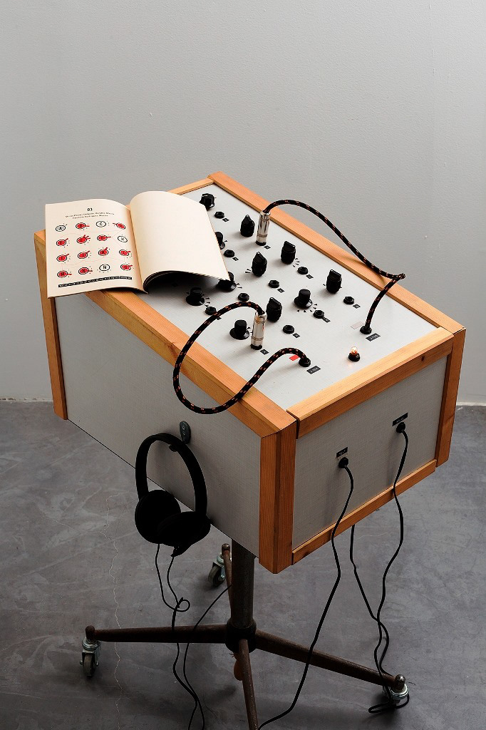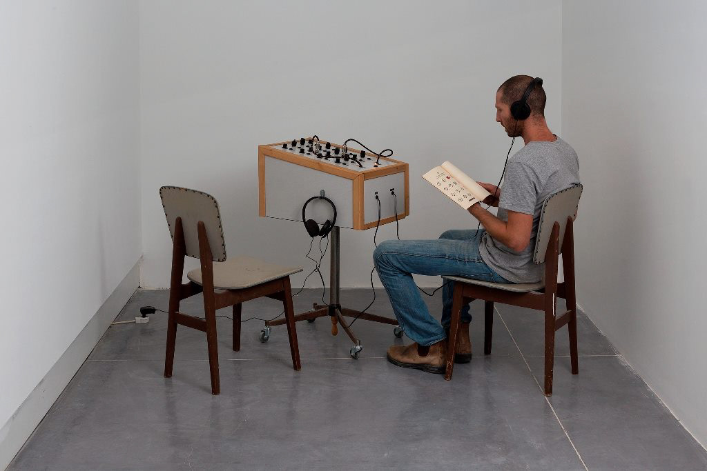 Formica and wood box, miniature printed circuit board (PCB), MP3 players, audio sockets and earphones, power supply, metal leg, two sofas from Casa Argentina, Jerusalem Text: João Delgado; music: Yarden Erez; electronic system: Amir Markovitz; programming